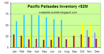 Higher-priced Westside inventory held up in August; only lower-priced Palms-Mar Vista reflects the flurry of conforming-loan sales. Note especially the monthly uptick in the Westside total (bottom chart).